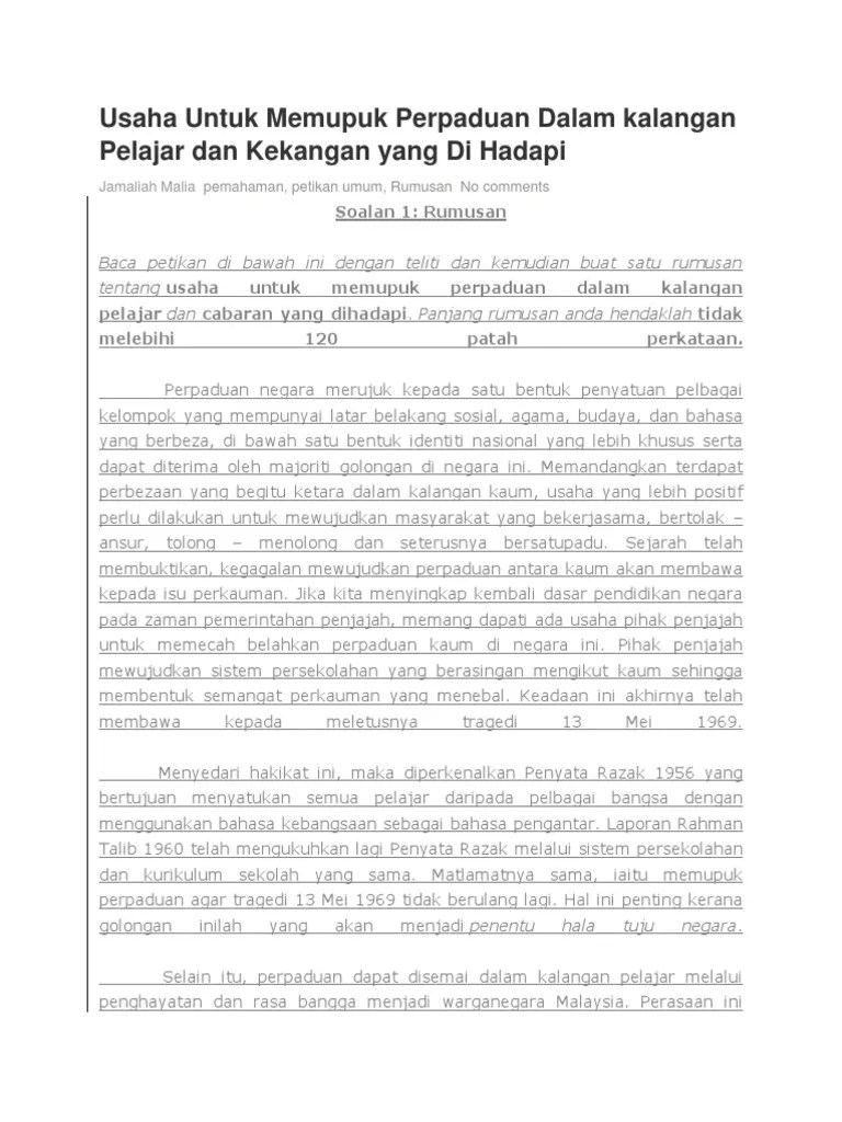 Perpaduan diterapkan melalui dasar sekolah kebangsaan dengan pelbagai kaum dibawah satu bumbungfokus 2 : Doc kepentingan perpaduan kaum yassvind raja academia edu. Rumusan memang tidak dapat dinafikan lagi bahawa perpaduan merupakan pemangkin utamakepada kemajuan negara yang kita kecapi sekarang. Sejarah telah membuktikan, kegagalan mewujudkan perpaduan antara kaum akan membawa kepada isu perkauman. Perpaduan dan keharmonian antara kaum adalah penting dalam masyarakat majmuk seperti malaysia. Banyak negara di dunia mencontohi malaysia sebagai negara yang berbilang bangsa, agama dan budaya kerana keharmonian dan kemakmuran antara kaum . Memang tidak dapat dinafikan lagi bahawa perpaduan merupakan pemangkin. Pengajaran rumusan usaha usaha perpaduan.